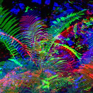 This abstract trichrome image shows ferns overlaid in a visually pleasing fashion. This image is created by combining 3 Images taken on film.