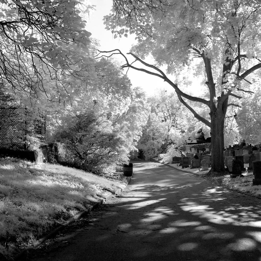 This infrared photograph shows a quiet graveyard illuminated in evening light.